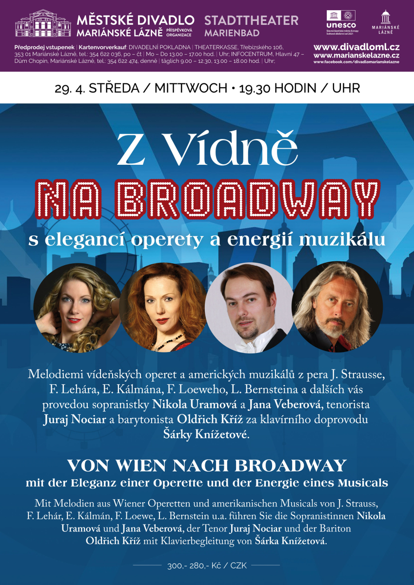 Melodiemi vídeňských operet a amerických muzikálů z pera J. Strausse, F. Lehára, E. Kálmána, F. Loeweho, L. Bernsteina a dalších vás provedou sopranistky Nikola Uramová a Jana Veberová, tenorista Juraj Nociar a barytonista Oldřich Kříž za klavírního doprovodu Šárky Knížetové.